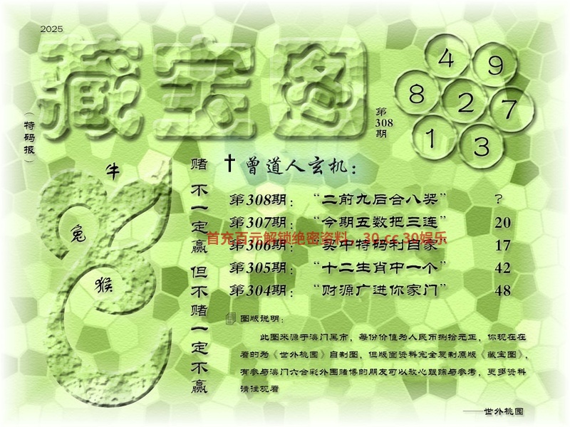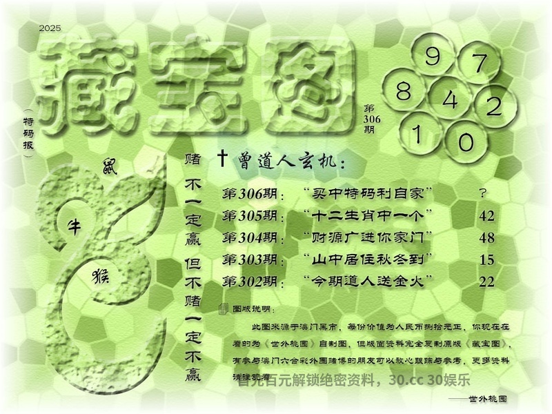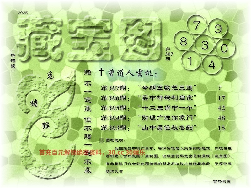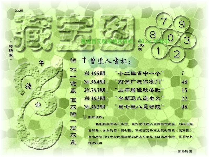 | 307期:澳门正版藏宝 【今期五数把三连】 解:今期五数把三连,五数三连,解肖猪羊兔蛇牛鸡。 综肖:猪羊兔蛇牛鸡狗 |